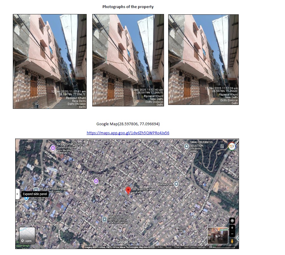| Description of Property | Description of Property (If Avaiable): Ground Floor, without roof/terrace rights, forming part of built-up property bearing New No. RZ-B-482, situated in Gali No. 01, admeasuring 90 Sq. Yards, out of Khasra No. 421, situated in the area and revenue estate of Village Nasirpur, now known as Kailash Puri, Palam Colony, Block-B, New Delhi. Bounded as under: East: Road 15 Feet Wide, West: Gali 10 Feet Wide, North: Other’s Property and South: Other’s Property |